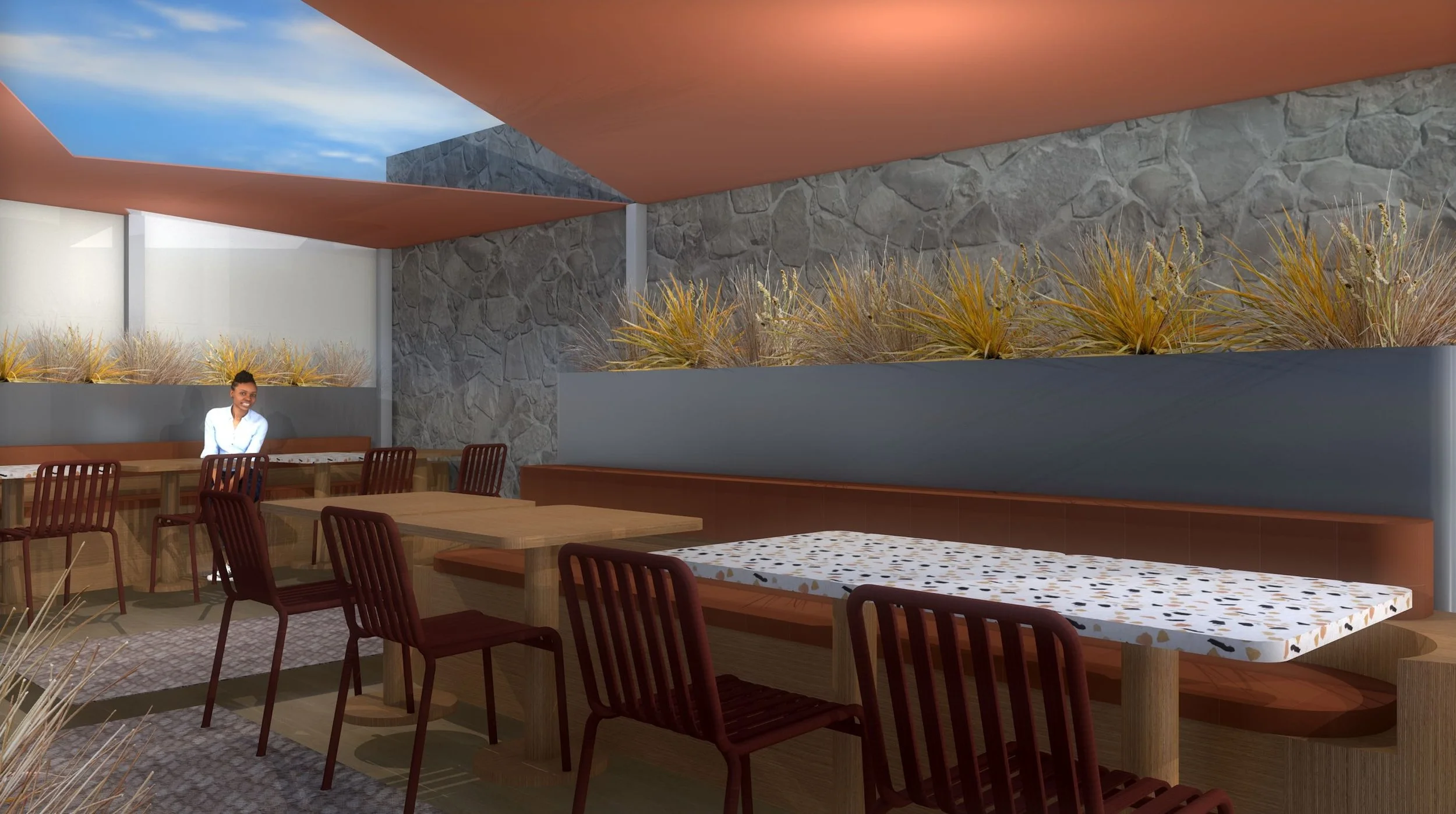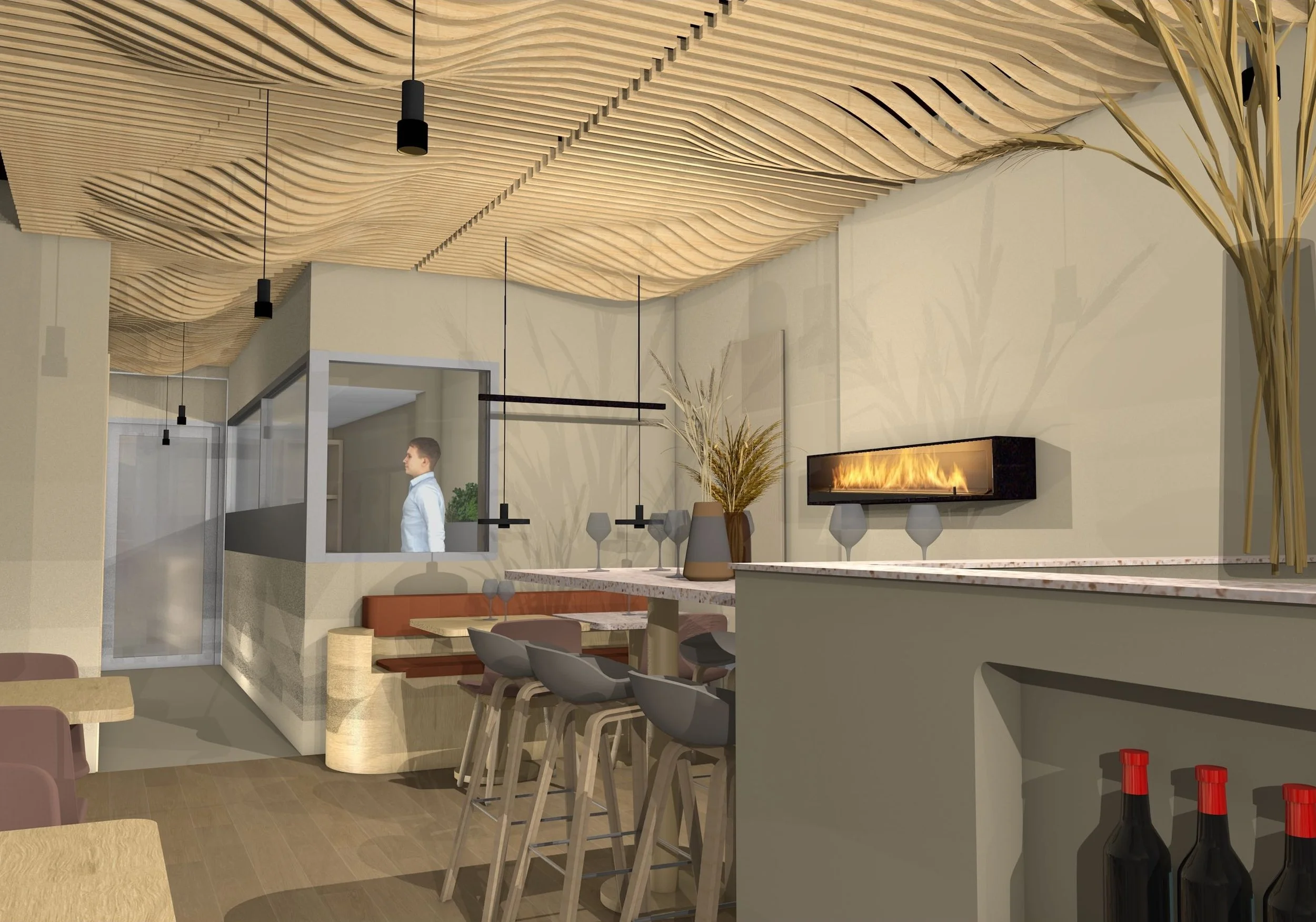 Matériaux bruts et nobles au visuel et au touché agréables afin de sublimer le lieu et inviter les clients à prolonger le moment à table : chêne massif de couleur claire, enduit terre, Terrazo/ marbre, couleurs automnales pour les assises et les tissus, luminaires d’ambiance placés au-dessus des tables, papier peint d'aspect naturel,...